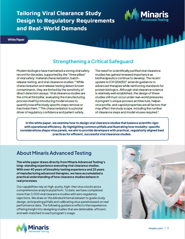 A global leader with 3,000+ studies and zero regulatory rejections, Minaris designs viral clearance studies aligned with ICH Q5A(R2), FDA, EMA and WHO guidelines. Dedicated viral clearance suites with AKTA systems ensure rigorous validation across vectors, proteins and vaccines, safeguarding patient safety and accelerating regulatory approvals.