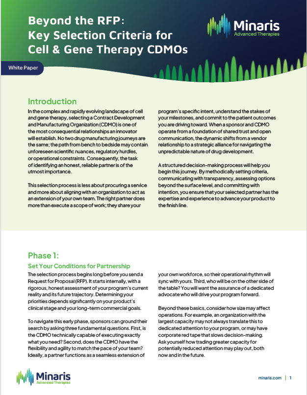 Minaris Advanced Therapies is dedicated to helping innovators in cell and gene therapy succeed. Whether you are in early-stage development or preparing for commercial launch, our end-to-end expertise, global reach and commitment to quality make us the ideal partner for cell and gene therapy manufacturing and GMP biosafety and analytical testing of all biologics.